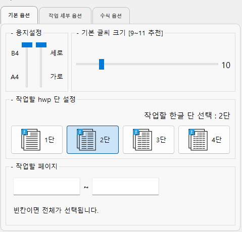 한글 작업 창 옵션 선택 하단에 모든 설정 초기화 가 있습니다.