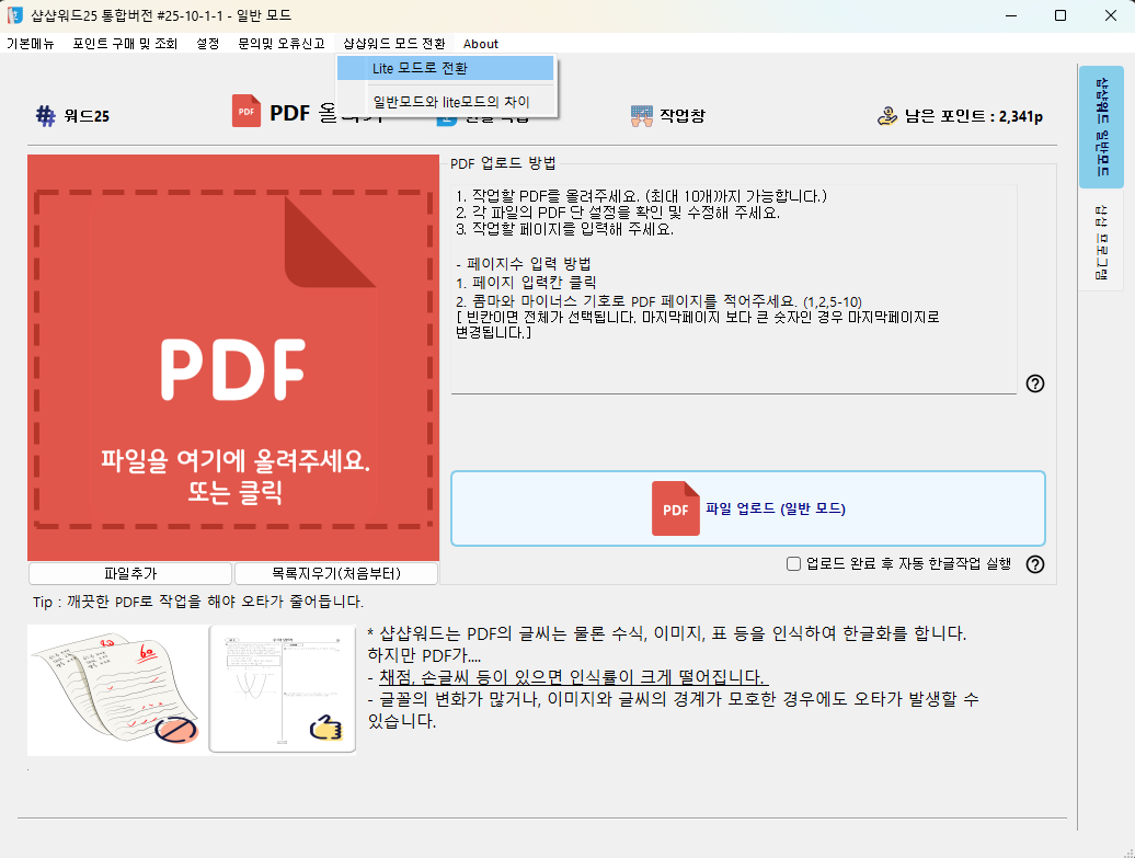 ★주의 : 일반모드와 lite 모드 는 PDF업로드 단계에서 결정이 됩니다.