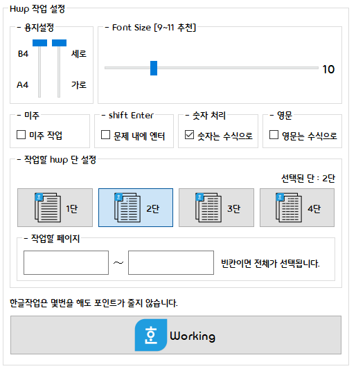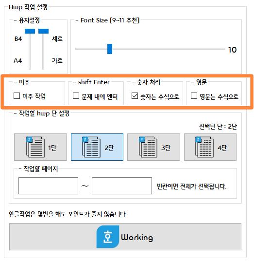 기본 설정 : B4, font 크기 10, 미주작업 X, 엔터는 그냥 엔터, 모든 숫자는 수식, 수식 안에 영문을 제외한 영문은 그냥 영문