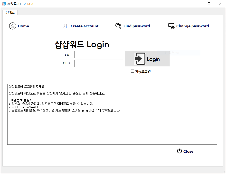- 샵샵워드가 실행되고 나면 로그인 화면이 나옵니다.