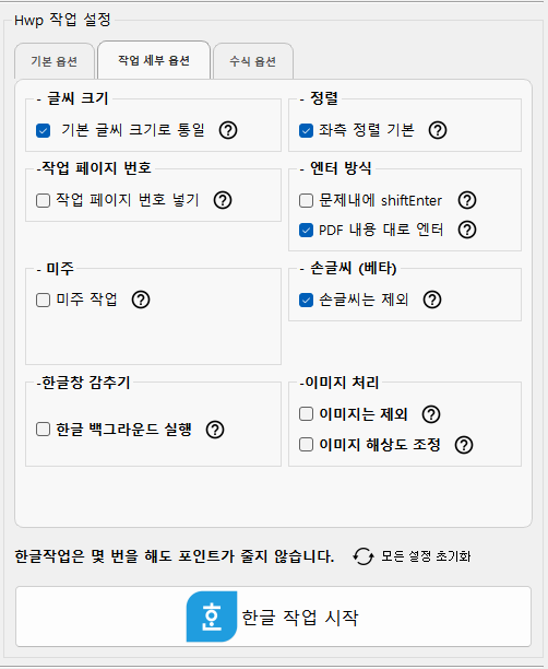 수정하실 부분을 하고 한글작업시작을 눌러주시면 됩니다.