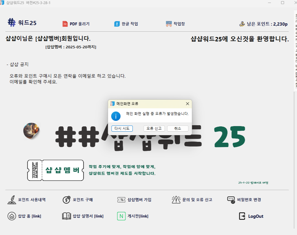샵샵워드의 어느 기능이 어떤 오류인지의 정보의 로그파일이 저희쪽으로 전송됩니다.