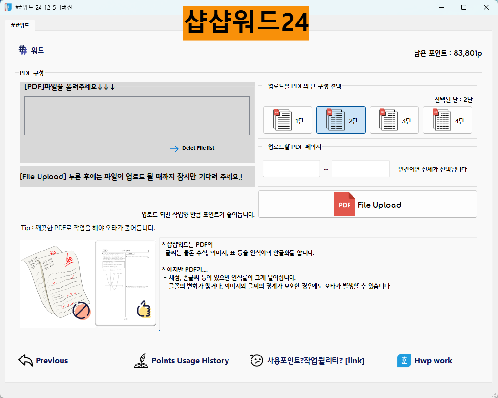 25-5-29-1 버전 이후부터 여러 PDF 파일을 한번에 업로드하여 작업이 가능해졌습니다.!사용법은 기존과 비슷하지만, 사용자 편의는 더욱 늘렸습니다.화면 구성1. PDF 업로드 창에 업로드할 PDF를 올려